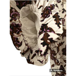 Very pretty off white blouse with a brown, purple, & black floral print all over.
