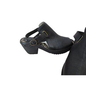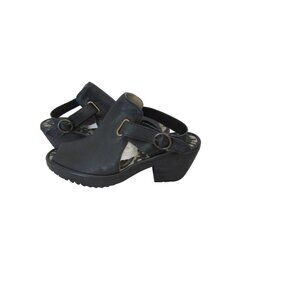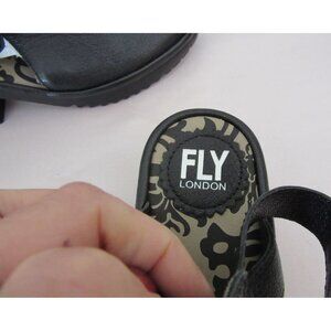 These FLY London sandals exude modern sophistication with their sleek black leather and stylish design. The heeled silhouette provides an elegant lift, while the patterned insole adds a touch of personality. Constructed with quality leather, these sandals are designed for comfort and durability, making them a valuable addition to any wardrobe. The shoes are new in size 37 which according to their site is a 5.5M. The heel is about 2.25" high. In nice shape, please see the photos.