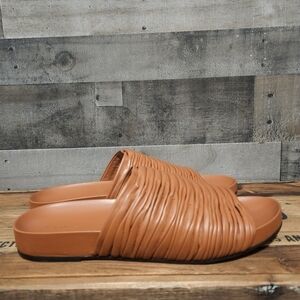 These supple leather slides are as stylish as they are comfortable, featuring curved footbeds and thick ruched straps that comfortably mold to the foot for a secure feel. Wear them with relaxed tailoring or feminine dresses…