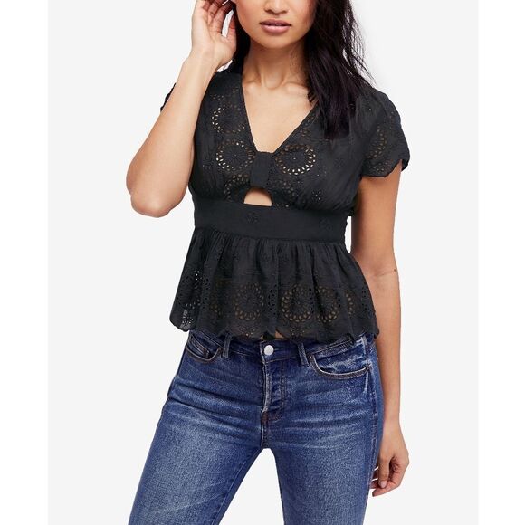 New! FREE PEOPLE Cutout Eyelet Black Top With Peplum Short Sleeve Size Small