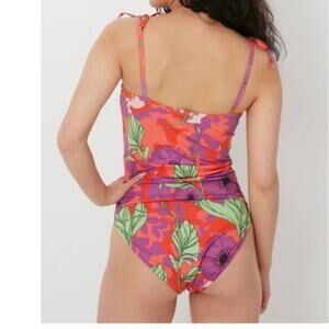 In collaboration with Roopa Pemmaraju, this so romantic and forever-femme swimsuit is featured in a slim-fitting silhouette and pull-on style with dainty shoulder-tie detailing, a straight neckline, and moderate bottom coverage.