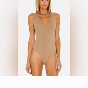 Stylish tan bodysuit with a deep V-neck design.