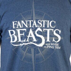 Brand new with tags, officially licensed men's size graphic tee in dark blue heather fabric with an elaborate gray compass image on the chest with the Fantastic Beasts logo superimposed in white in all its glory, the prequel to the Harry Potter movies with protagonist Newt Scamander.