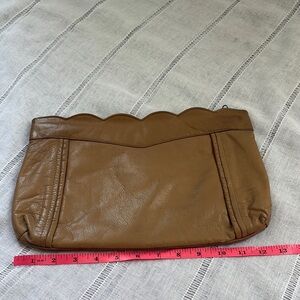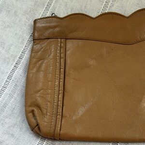 New Fashion Collection Vintage Leather Clutch with Scalloped Edge. Gives 80s aesthetic. Some discoloration but no wear on the leather. So much life left in this vintage piece. One large compartment and zipper pocket. Beautiful brand label. Genuine leather. This clutch features a unique scalloped edge, adding a touch of elegance to its sleek design. Western vibes, style with cowboy boots and a prairie skirt or maxi dress.