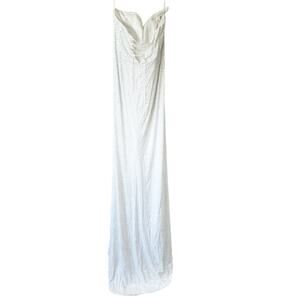 New with tags! Gorgeous strapless bright white maxi dress gown. Wired bust with appointed top for an asymmetrical look. Fitted with bust pads. Fully lined with a high slit on the left side and side ruching for a flattering fit. Train in back adds the perfect amount of dramatic effect. Perfect for a bride, bachelorette party, bridal event, prom, dance, gala or special occasion