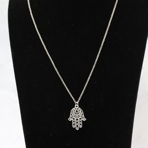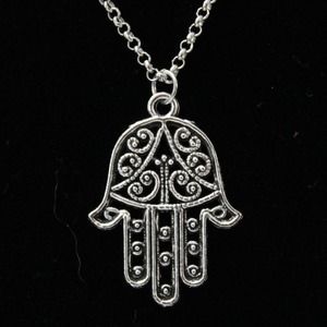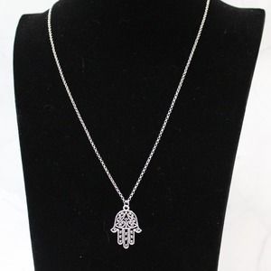 The new silver tone necklace has a 1 inch fatima hand and is on a 20 inch chain.