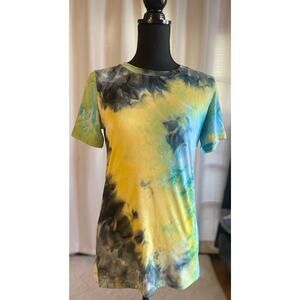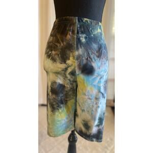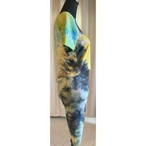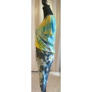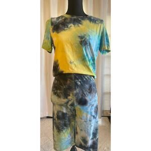 Soft, blue, yellow and green two-way stretch tie dye short set with decorative double stitch design.