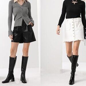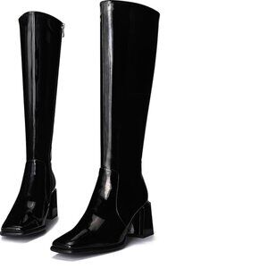 Women's Knee High Boots Block Metal Heel Square Toe Side Zipper Soft PU Leather Classic Fashion Dress Long Boots