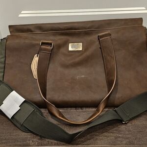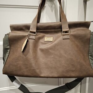 Rugged and Durable Finley Mill Duffle Bag with 35L Capacity Two Brown Handle Vegan Leather Straps with a Army Green Canvas Handle that Snaps. Zipper and Button Snap Closure and an Army Green Canvas Long Shoulder Strap with Padding.