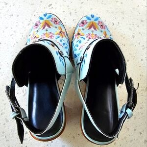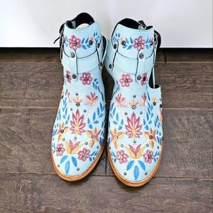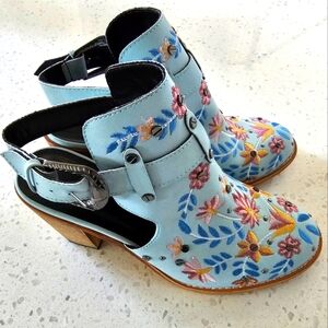 New without Tags, Super Cute and Never Worn, the Powder Blue Floral Embroidered Sandal is Versatile with Jeans, Shorts, and a Dress. The Vegan Leather Pink, Yellow, White, and Burgundy Embroidered Flowers are Surrounded by Silver Metal Hardware. Each Adjustable Strap has a Silver Hardware Buckle. Distressed Design 3.5" Heel. Whether it be Boho, Western, Vintage, or Contemporary, all Styles are Covered with this Sandal Shoe.