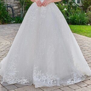 A long mesh ball gown crafted for a grand bridal entrance, this design features a romantic sweetheart neckline and off-shoulder straps that frame the silhouette with gentle softness. The layered skirt flows with regal volume, while the boned bodice, floral lace, sequins, and beads create a luminous, ornate finish. Paired with its short veil, the gown delivers a complete wedding look rooted in elegance and poetic femininity.