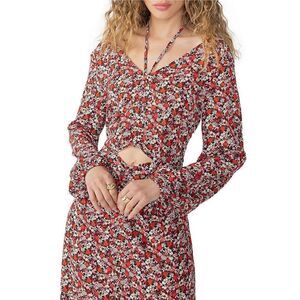 New Floral Print Chiffon Halter Neck Long Sleeve Front Cut-Out Midi Dress