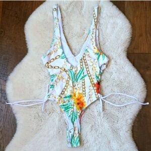 New Floral Print Side Lace Thong Back One-piece Bikini Swimsuit Size L