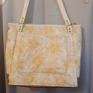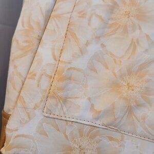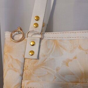 This beautiful shoulder bag is perfect for any occasion. With its unique design featuring a pebbled finish faux leather bottom and floral pattern, it is sure to turn heads. The bag has a spacious interior with multiple pockets and a cotton lining. Beautiful faux leather contrast fabric. It also features 2 external pockets for great organization. Gold-tone hardware really pep up this beautiful neutral white and gold floral print and rich light camel brown faux leather trim. D-rings on straps for easy accessibility to contents and webbing straps for comfortable carrying. The bag is made of a cotton blend/ faux leather material and has a white handle/strap color. It has double handles straps of 20 inch length end to end. The bag is handcrafted and is one of a kind limited edition design. Perfect for all occasions and settings. Designed with versatility in mind!