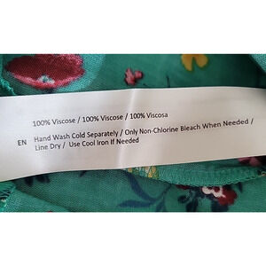Features: flutter cap sleeves, waist tie, tiered skirt, mini length, green with multicolor floral, back tie at shoulders, 100% viscose