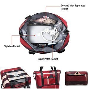 Multi-Pocket Duffel Bag With Trolley Sleeve: The weekend bag has a large main bag, front zipper pocket, back zipper pocket, folded zipper pocket, two Inside patch pockets, shoe compartment and a dry wet separation pocket. Fastening the overnight bag to your luggage with a trolley sleeve can effectively relieve the pressure on your shoulders, quite conven