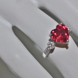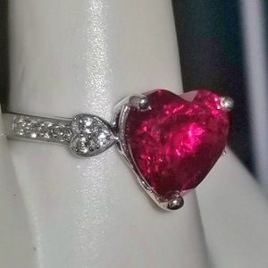 New and unworn ruby heart shaped solitaire with genuine diamond accents set into a 925 marked band. Weight is 3.1 grams. 6mm heart gemstone. 14 total diamonds. Size 7
