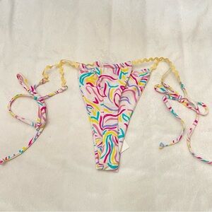 Colorful For Love & Lemons bikini bottom with vibrant swirl design. Features pink, blue, yellow, and white tones. Ideal for beach fun.