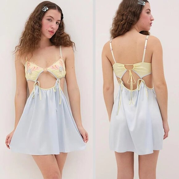 For Love & Lemons Yellow Blue Pastel Papillon Embroidered Slip Dress Size L