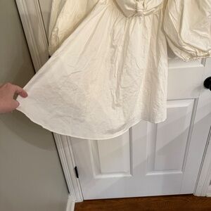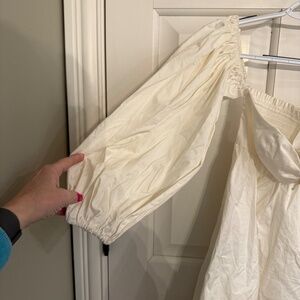 Off-the-shoulder puff sleeves bring the drama to this white babydoll with a tie front and smocked back.