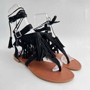 New Forever 21 Fringe Thong Sandals Up Leg Ties Black 6.5