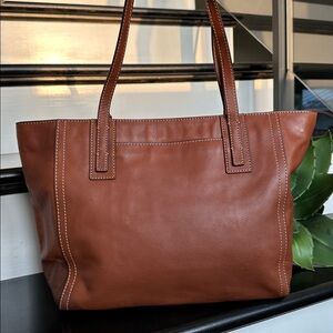 This Fossil genuine leather tote bag is soft and luxurious to the touch and shows no signs of wear, appearing new. The rich brown leather is complemented by contrast stitching and a Fossil purse charm with key accent for a stylish touch. The strong and secure top zipper opens to a clean matching brown canvas lining with no signs of use. Inside, you’ll find a spacious main compartment with slip pockets and a zipper pocket to keep your items organized. The shoulder straps are comfortable to carry and show no cracking or wear, making this tote both durable and comfortable to carry.