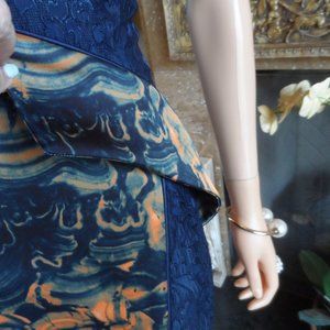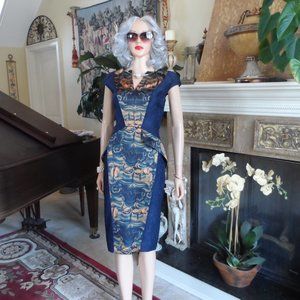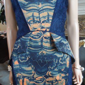 New Fotini Navy Blue Lace Dress w/Orange-Blue Abstract Print Inserts Size 8