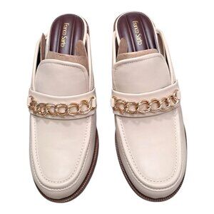 Step into elevated style with the Franco Sarto Katra Clog Platform Heels in Chiffon Beige. These chic slip-on clogs feature a modern almond toe, sleek faux leather upper, and a chunky platform heel that adds effortless height and elegance. A gold-tone chain accent across the front adds a fashionable touch.