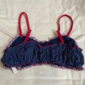 Chic navy polka dot bikini top. Features bold red straps. Ideal for a stylish beach day.