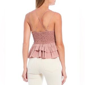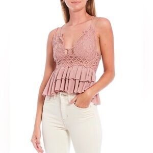 New Free People Adella mauve Barbie pink Lace Smocked Blend Ruffle Layered Cami