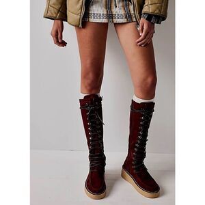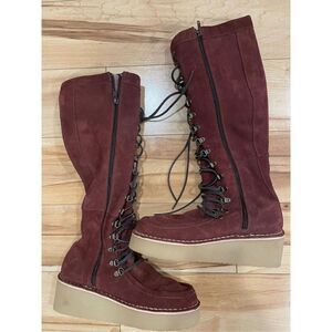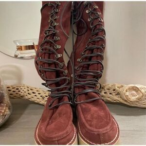 A statement pair for when the weather turns cold, these so special lace-up boots are featured in a dreamy suede fabrication and tall style. *Features:* Pull-on style, tall design, lace-up closure, soft suede fabrication, round toe, moccasin-inspired base, seamed detailing, slight wedge platform sole, inner leg zipper*Why We <3 It:* These effortlessly cool boots add some edge and warmth to any outfit.