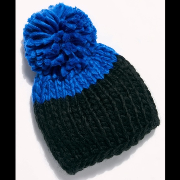 Free People Cozy Up Color Block Pom Beanie - Black/Blue. New with tags. From hitting the slopes to everyday style, this color blocked beanie is featured in a chunky knit fabrication with exaggerated pom-pom feature at top