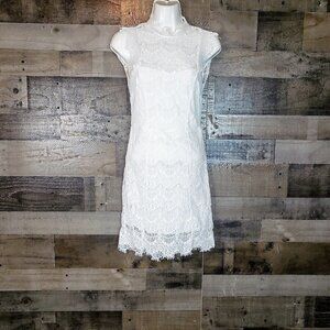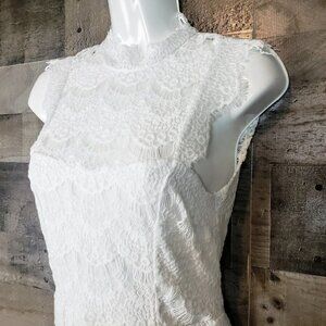 Bodycon lace slip with a high neck and scalloped trim. Frayed cap sleeves and an open cutout in back. Lining features a sweetheart neckline.