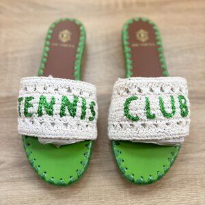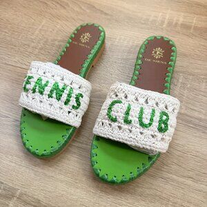 Features: Slip-on style, backless design, woven raffia toe straps, open toe, "Tennis Club" narrative embroidery, stitched midsole, flat rubber outsole