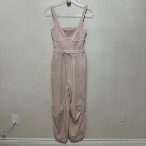 Features: Soft fabrication with stretchy feel; square neckline and detailed bust seaming; large side pockets; ruching around the knee; elastic ankle cuffs; straight-leg bottom; adjustable drawstring waistband