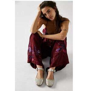 New Free People FP x Anna Sui Poppy Embroidered Pants Set $298 SIZE 2 Wine Silky