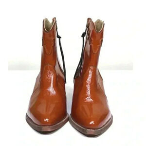 Stand out in these patent leather ankle boots in a western-inspired silhouette featuring a stacked heel and pointed toe.