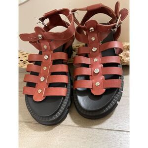 Features: Slip-on style, ankle length, strappy leather uppers, adjustable buckle straps, molded footbed, hammered stud details, lug sole