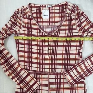 Get cozy in style with this Free People thermal one piece. Designed in a soft waffle-knit fabric, this jumpsuit features a fitted silhouette with long sleeves, a plunging V-neckline, and button-front details. The rich burgundy and cream plaid print adds a trendy twist to this loungewear essential.