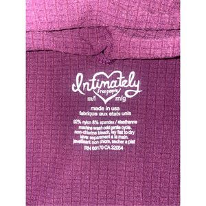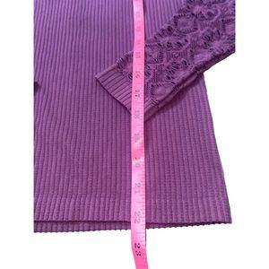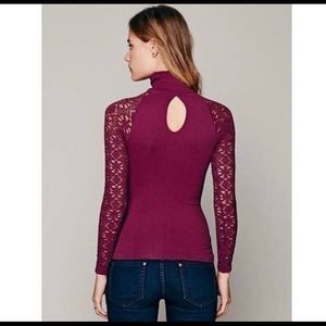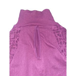 This top is a gorgeous plum or berry color. It is a mock neck, ribbed body and lace like arms, and tear drop upper back opening. It is a pull over top and appears as mostly seamless.