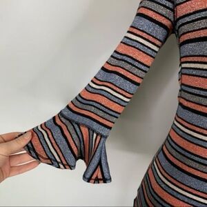 New Free People L Surprise Party Ruffle 3/4 Sleeve Top Grey Multicolor Metallic