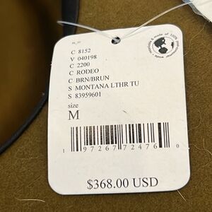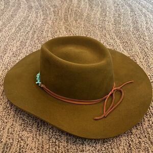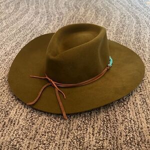 Features: Structured style, wool fabrication, wide brim, dipped crown, silk and suede band, brass and turquoise stones