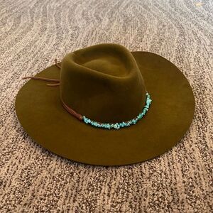 Handmade with love and care, this artisan hat from Lovely Bird is featured in a wide brim style and quality wool fabrication, completed with silk and turquoise stones for an eclectic touch.
