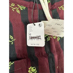 Distinguished by numerous large utility pockets, the Arezu Cargo Pants are a high waisted handwoven cargo pant, merging the worlds of fashion, form, and function. Fitted waist that loosely widens as the legs elongate fastened by a hidden hook and zip closure. Featured in burgundy with thick stripe detailing in black and lime green roses throughout.