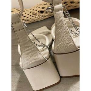 Features: Slip-on style, leather fabrication, strappy design, square toe, attached chain detail, adjustable buckle ankle strap, chunky block heel, lined footbed