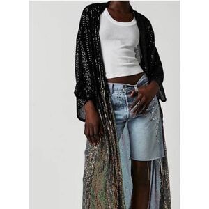 Features: Semi-sheer fabrication, all-over sequin embellishment, open front design, long relaxed sleeves, contrast sequin icicle design