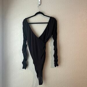 Ruched long sleeves frame this stretchy, curve-skimming bodysuit designed with a chic surplice V-neckline.