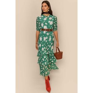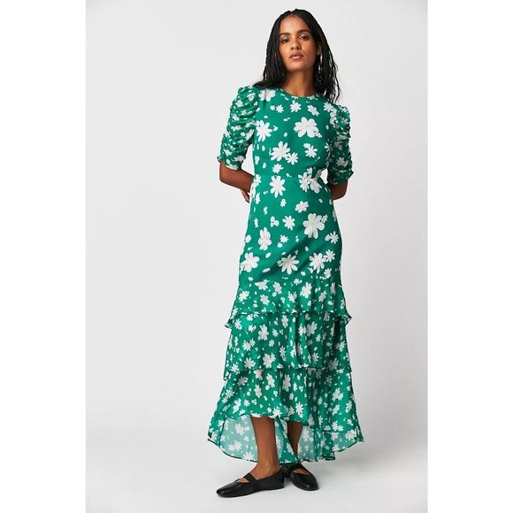 Beautifully printed and featuring a decidedly flattering fit, this timeless maxi dress features ruched sleeves, an empire waist and a ruffled hem at the bottom of the dress for added shape.