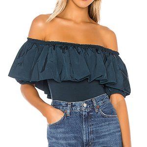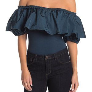 The perfect outfit begins with this sleek, demure bodysuit! Sleek woven fabric, with a satin-y sheen, shapes a ruffled, off-the-shoulder flounce and short puff sleeves with elasticized cuffs. Below, jersey knit forms the fitted bodice and attached thong bottoms with two snap closures.