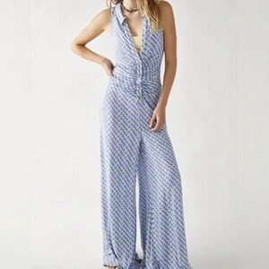 New Free People Shayla Halter Jumpsuit One Piece Wide Leg Button Down